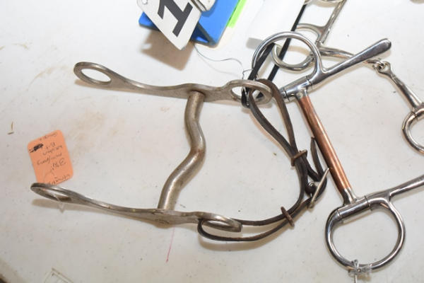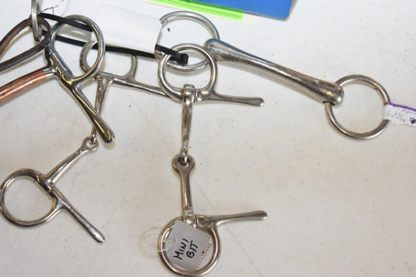 Lot of 5 3 3/4" pony/mini bits including a western grazing bit, a straight mouth copper driving bit, straight bar O-ring, and 2 spoon driving bits