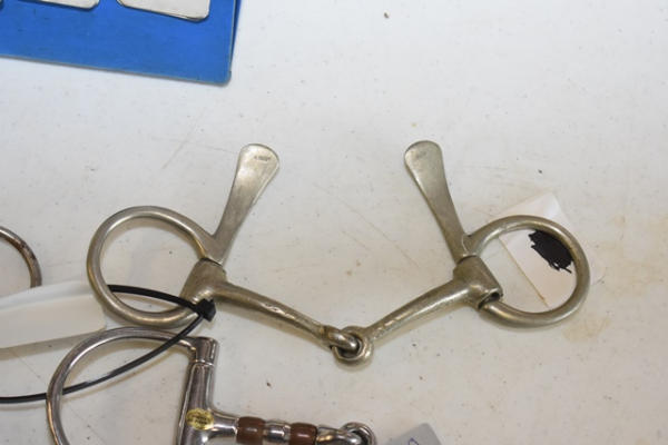 Lot of 5 4 1/2" bits including a copper roller that spins D-ring snaffle, Never Rust (stamped Made in England) spoon bit, O-ring snaffle, 4 1/2" with 3 1/2" shank solid port lolling bit and an over check