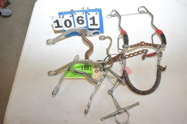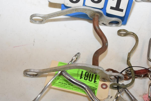 Lot of 5 4 1/2" and 4 3/4" bits including a chain mouth hackamore, a grazing bit, a full cheek snaffle, aluminum shank copper mouth western bit, and over check with high port lolling
