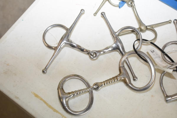 Lot of 5 4 3/4" bits including an egg butt slow twist, a rubber mouth d-ring, a full cheek copper twisted wire, a slow twist full cheek and a Never Rust (Made in England) full cheek snaffle