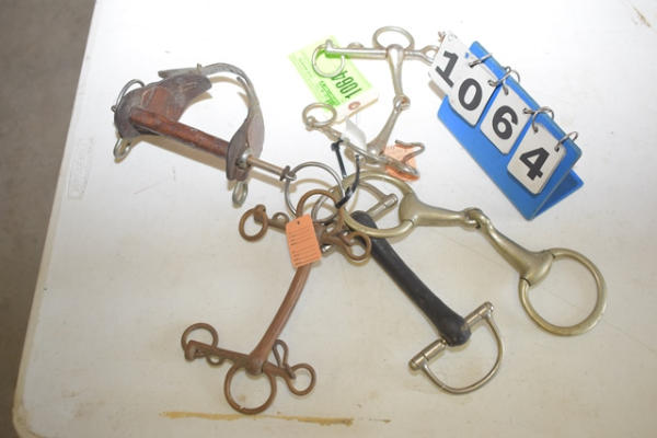Lot of 5 4 3/4" bits including a leather covered bit with outside slider rings, a soft mouth d-ring snaffle, an antique finish copper Pelham, Never Rust very fat mouth English snaffle, and a Pelham