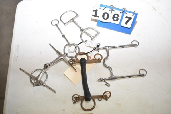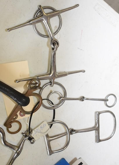 Lot of 5 4 3/4" bits including a Korsteel long shank corded bit, a hard mouth rubber covered Pelham, a d-ring snaffle, a foamer and an over check