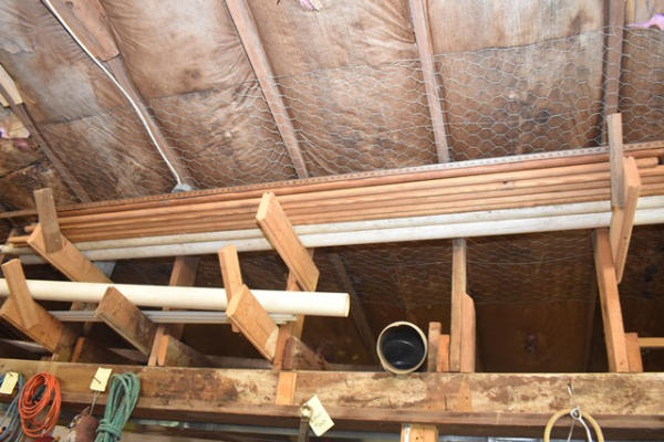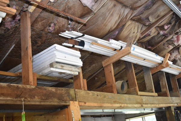 Mixed lot including 9 shutters, misc. wood pulls, PVC pipe, trim work, overhead racks, and shutters