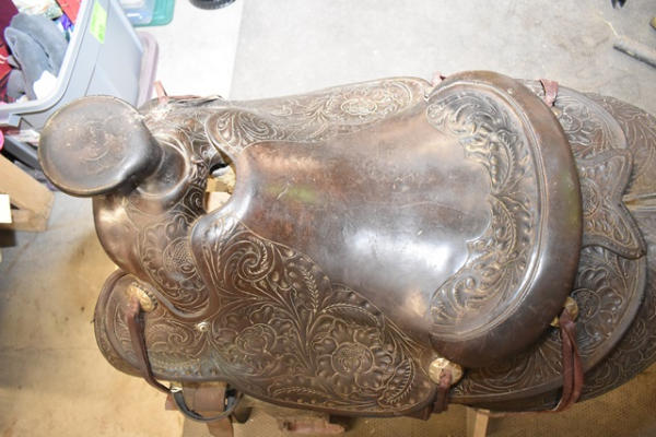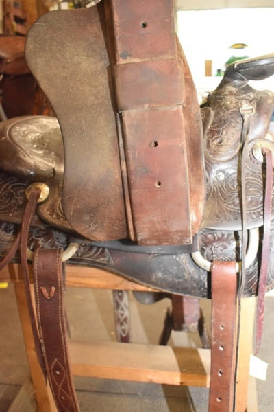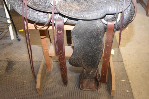 16" seat, 7" gullet, heavy duty roping saddle with floral tooled designs, leather covered Blevin buckles, matched floral tooled stirrups