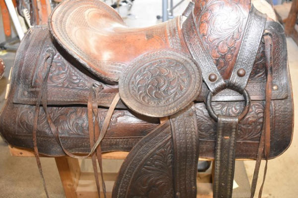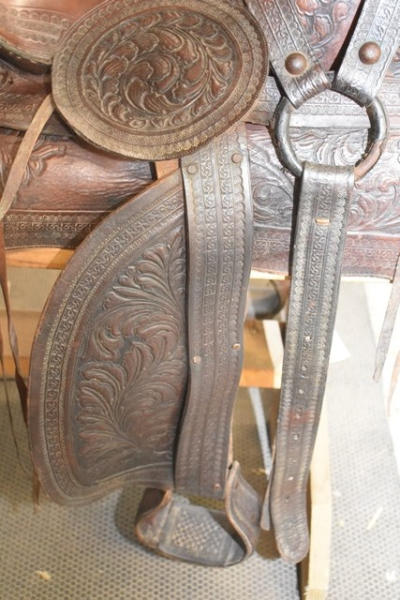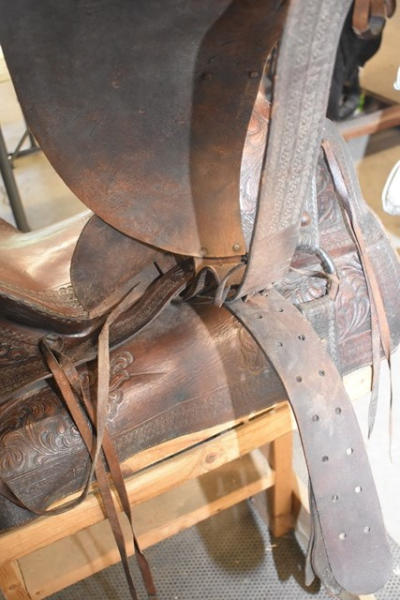 Saddle, Sam Stag rigging vintage square skirt with stripe underside, high fork, A fork, 14" seat, 5" gullet, outside fender straps, a unique piece