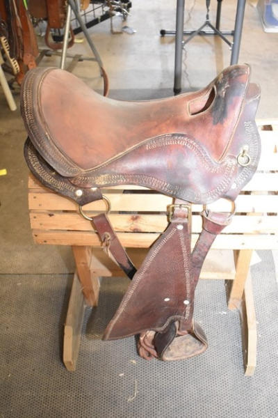 Pegasso, Hecho en Columbia, 13" front to back, seat 18" when measured English style (measured button to back), high back seat, trim saddle, no horn, open gullet area, with double rigging, matching fenders and leather stirrups