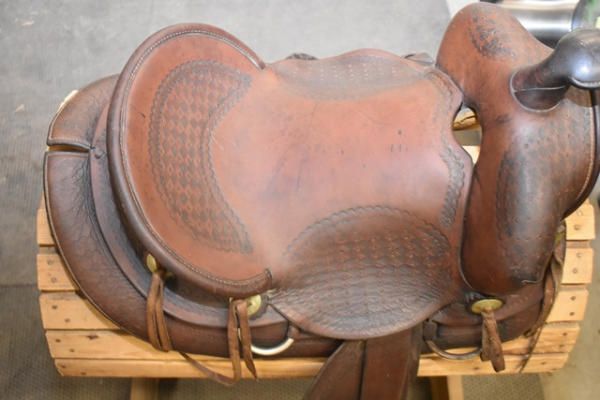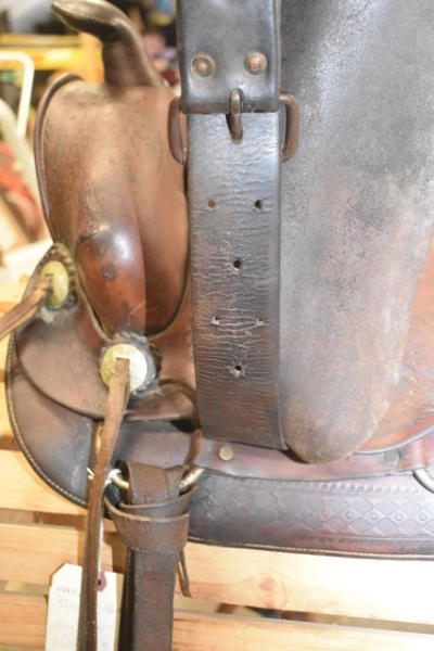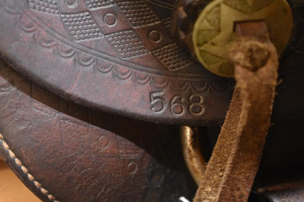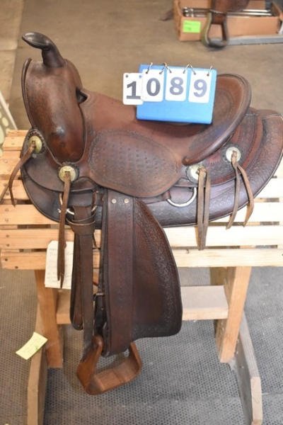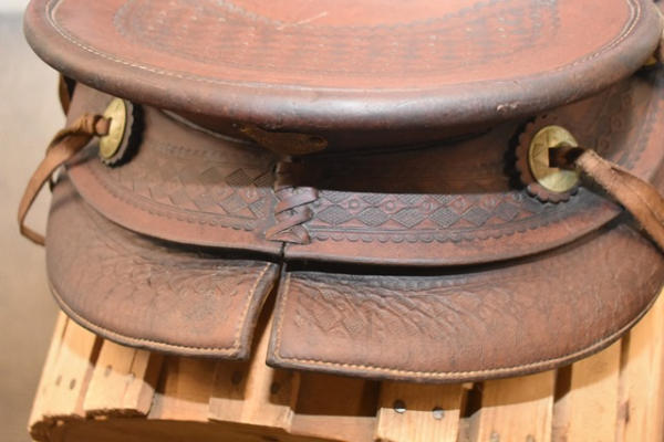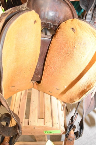 Famous Jumbo Brand saddle with 14" seat, 5" gullet, #568 stamped on it, outside fender straps and a wide swell, Sohoeukoff, Made in USA, with antique wooden stirrups