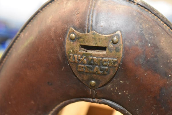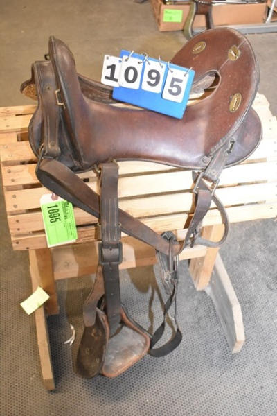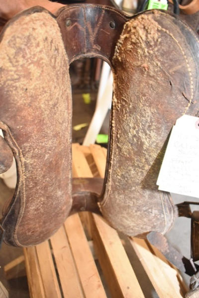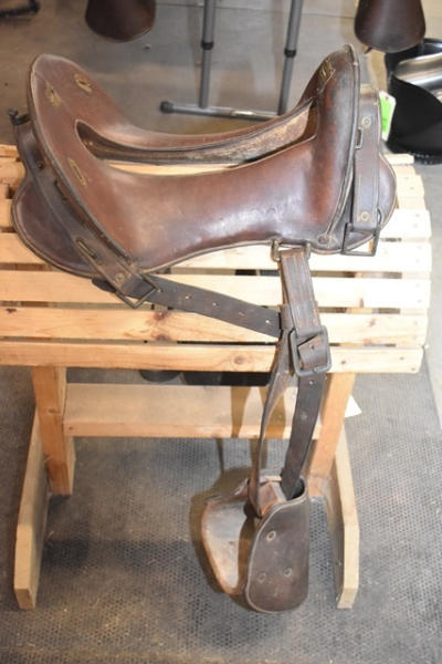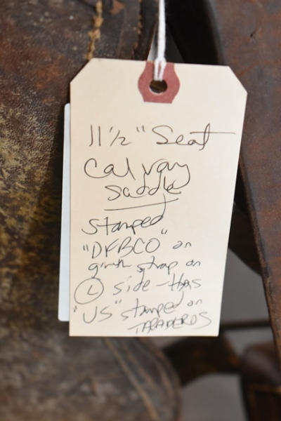 11 1/2" seat Calvary saddle, stamped "DFBCO", has girth strap and left side has "US" stamped on the tapaderos, open gullet, high back, used mostly for military