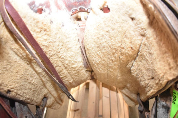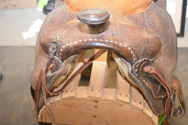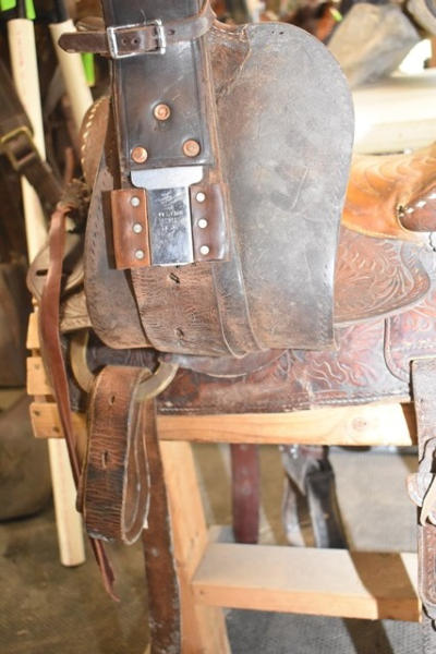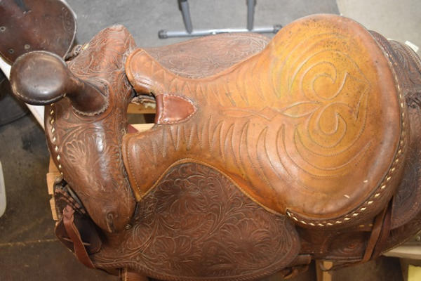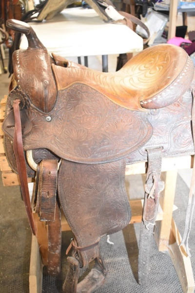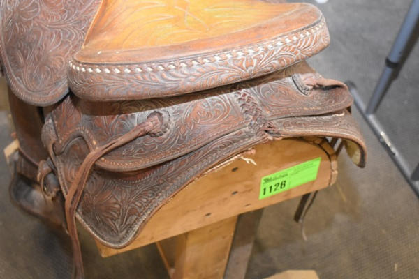 Hereford saddle with 15" seat, 6" gullet, floral tool design, padded seat saddle, leather covered tooled stirrups, with matching fenders and Blevin buckles