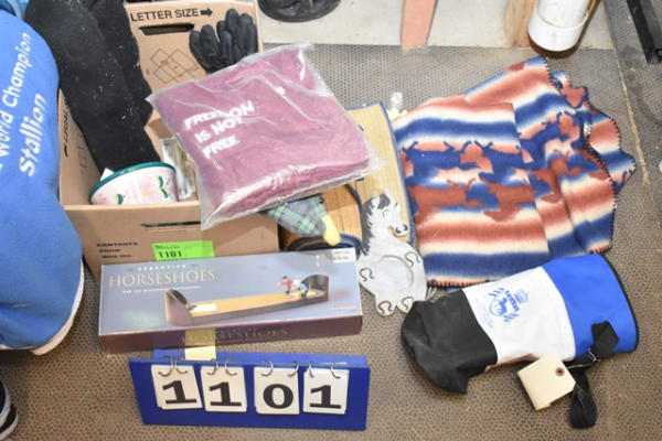 Box lot with Executive Horseshoe Game, winter glove and hat set, black door draft, Friesian tote bag, flower planter, duck door draft, 2 throw rugs (1 with horses), and a fold out rattan mat