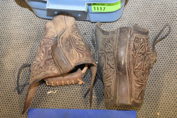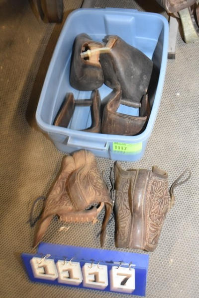 Tote with floral parade tapaderos, black plain design tapaderos, 1 pair of extra wide leather stirrups