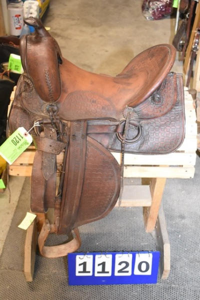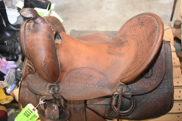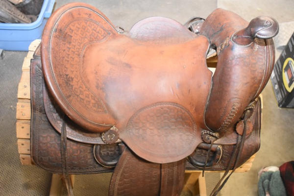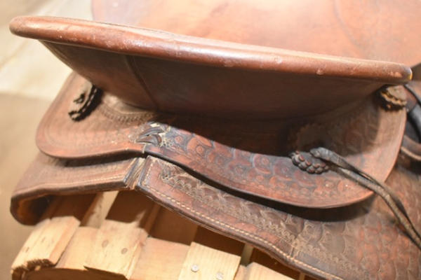 Deep seat 14" saddle seat, 6" gullet, vintage, round, rose pattern with a A fork and outside fenders, straps and leathers with covered ring billets and wooden stirrups, double rigged with the outside stirrup leathers, antique wood stirrups