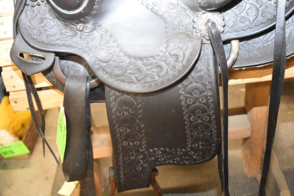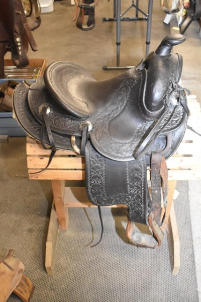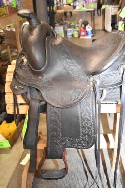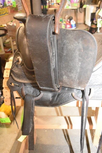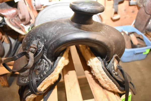 Hillmaker nice heavy weighted, vintage saddle, 14" seat, 5" gullet, metal lined mahogany stirrups with Blevin buckles and double rigged with a round skirt