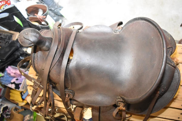 Kid's A fork vintage saddle, ready to ride with new fleece, has a matching bridle that is spotted, 11" seat with 5" gullet, cute kid's saddle
