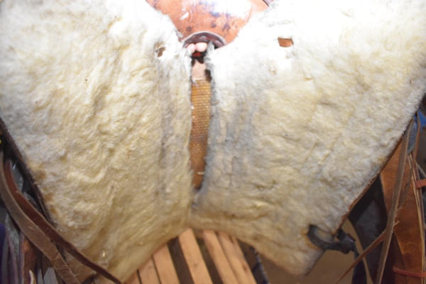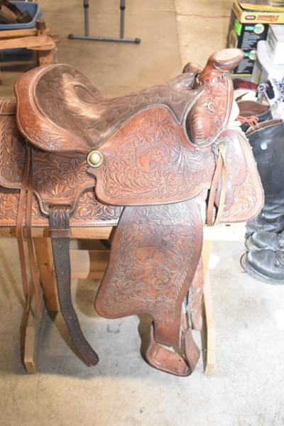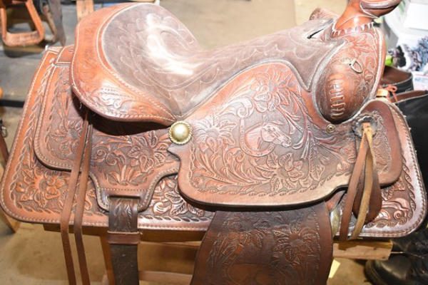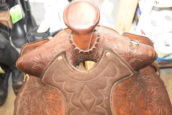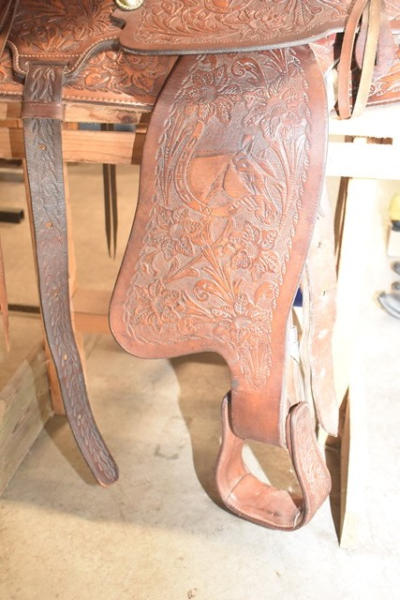 Western seat saddle, 15" seat, 6" gullet, has horsehead design stamped into the fenders, saddle is by Western Saddlery with Big W Performance Line #1200, has Blevin buckles and matching stirrups
