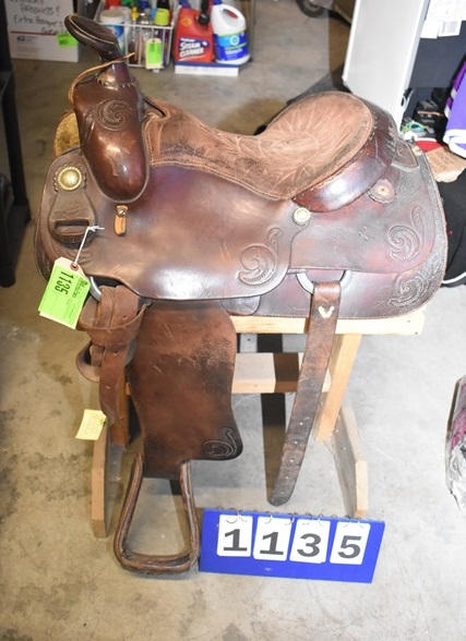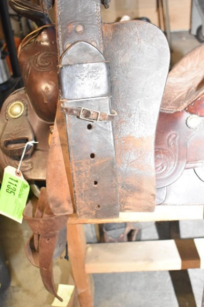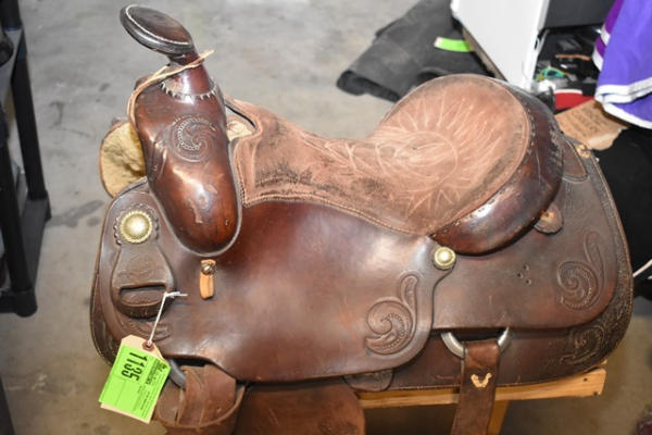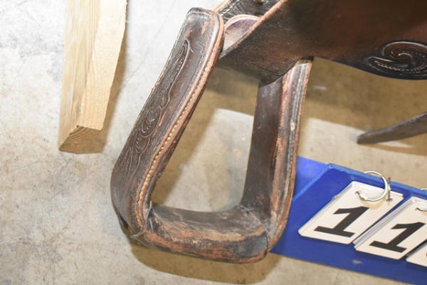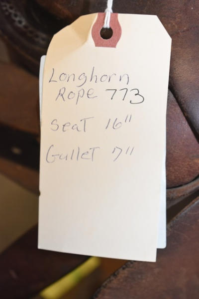 Longhorn roping saddle, #773, 16" seat, 7" gullet, has scallops type minimal trim, big strong saddle horn and a suede out padded seat with leather covered Blevin buckles