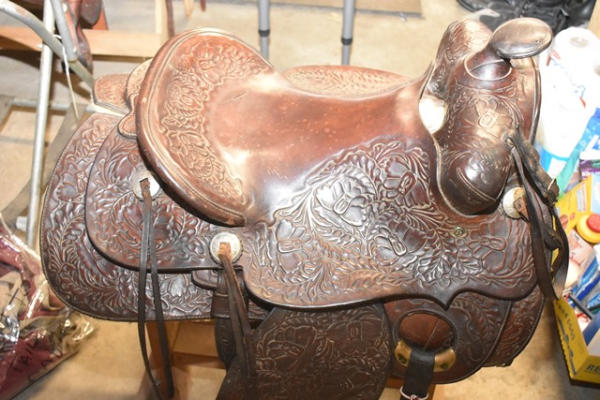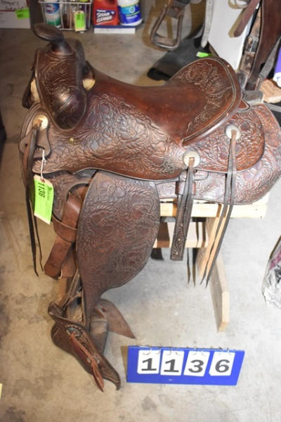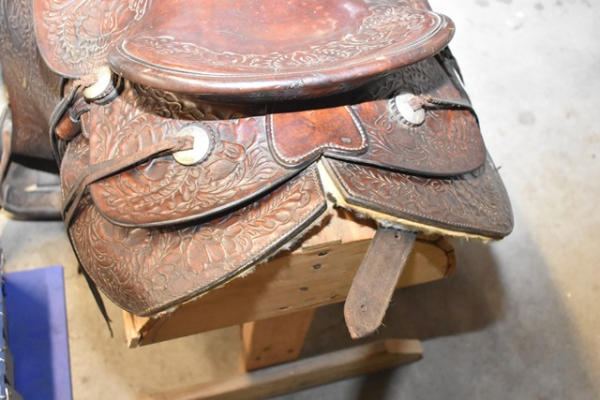 Floral tooled saddle with old tapaderos, heavy duty, vintage older saddle, probably from the 1940s or 1950s, has floral scallop trim and good fleece