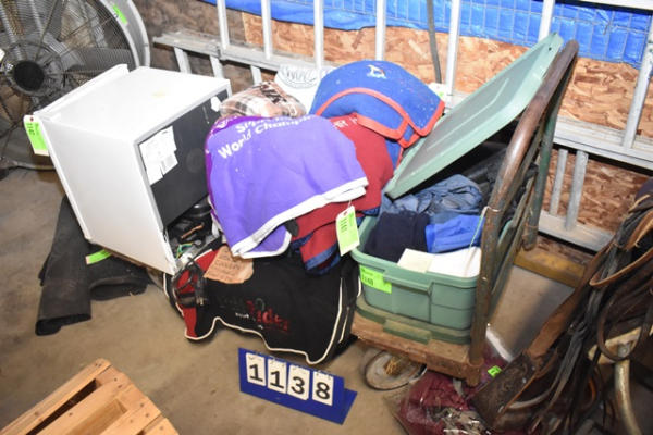 Large hay carry travel bag, corner vinyl hay trailer feeder, driving apron, 2 saddle towels and a carry tote