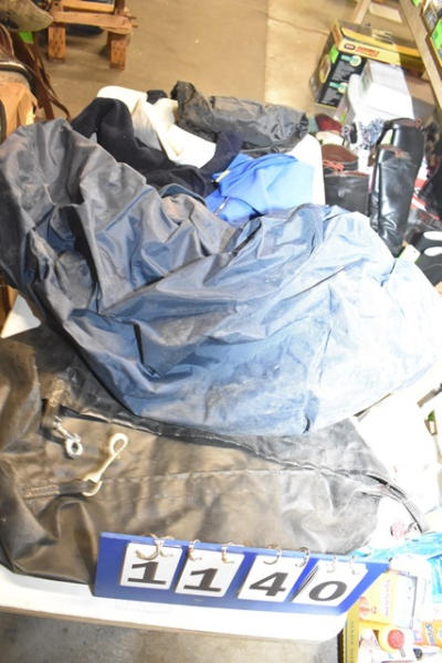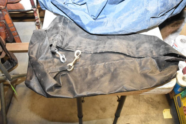 Lot includes a large Dura-Tech tack bag, South Texas Pinto 5 point champion, a saddle towel and driving apron and trailer or corner hay feeder, etc.