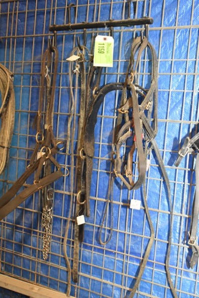 Tack lot including miniature horse size spare parts including britching, lead chains, tie backs, set of traces, belly band, a couple different bridles (1 with red brow band, 1 with round D-ring shape), 2 small back pads