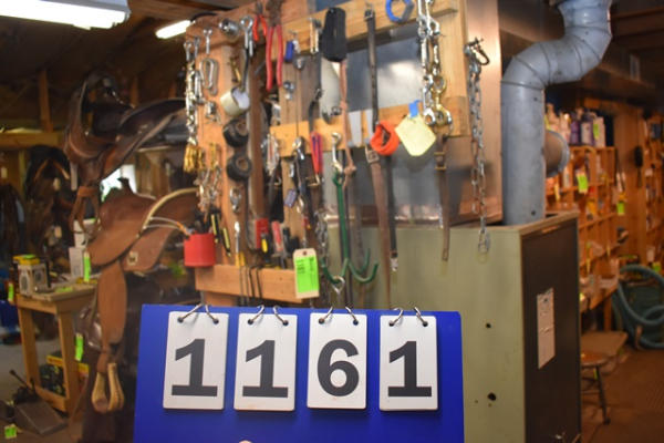 Lot including double ended snaps, quick links, brass double snaps, a few screwdrivers, some tack hooks, some misc. chains, tape, electrical tape, hoof picks, pliers, some tie back straps, some screw eyes, fence pliers, etc.