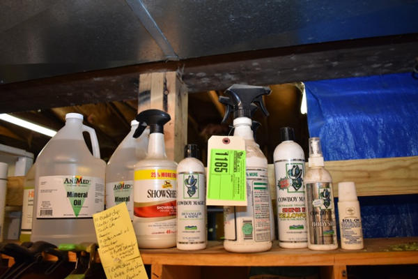 #1165 – Lot of 10 blanket clips and cleaning products including Leather Sheen, Saddle Lac, bottles of ammonia, 2 gallons of mineral oil, Show Sheen, Cowboy Magic, 2 bottles of detangler, 3 bottles of Cowboy Magic Green Spot Removal, 1 bottle of Shine In, 1 bottle of Body Shine and a roll-on repellent