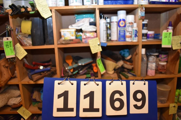 Contents of 4 cubbies including baby wipes, towel and blanket clip, twitch, Peppy Grand Champion Coat Spray, Cowboy Magic Detangler, a collection of hair brushes, collection of body brushes including mud and soft brushes and hook picks