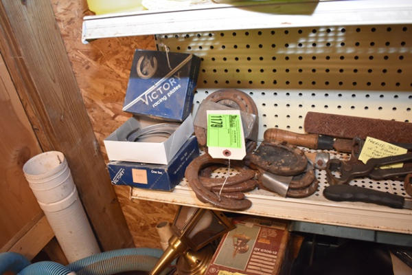Victory Racing Plates, brand new, 2 sets of Cobb/Horse size shoes, small set of mini/Shetland pony size (3 have pads, 1 does not), and farrier tools including rasps, nippers, cutters, hook knife, etc.
