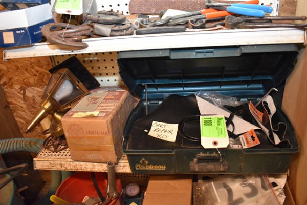 Brass plug-in stall lamp, was used outside tack stall, plugs in and lights up and a cart repair kit (includes the flange, trim work, black vinyl repair in a case)