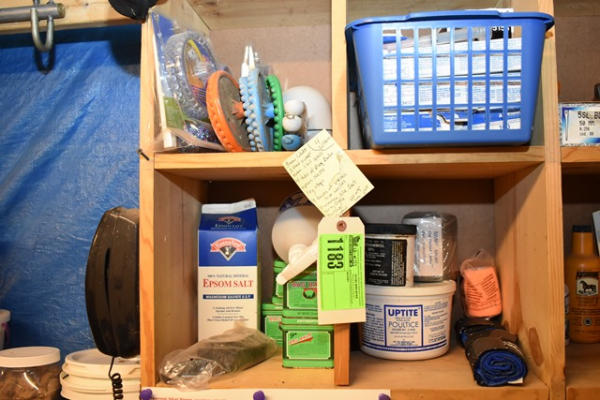 Contents of 4 cubbies including 3 new Likits, 3 feed scoops, extra Likit spools, 4 tubs of Bag Balm, Epson Salts, leg straps, 9 boxes of various size needles, Duramax ice boot, spray bottle, Ichthammol, vet wrap, and sam splints