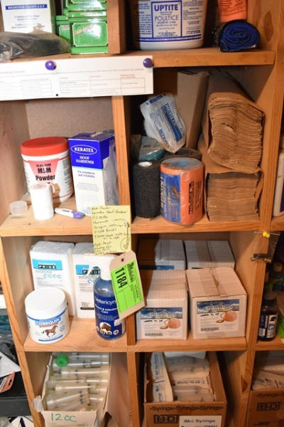 MSM powder, hoof hardener, pill cutter, thermometer, Cosequin, Vetricine, 2 salt bricks, 4 Himalayan salt licks on a rope (brand new), paper towels, bandage rolls, sam splints