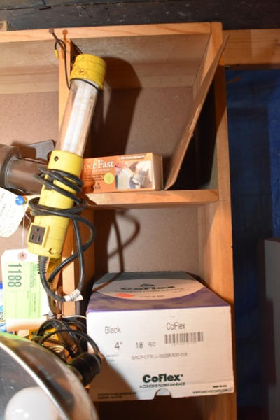 50mm farrier nails, brown clip on light, yellow work light that can be hung, aluminum clip on light (large), Super Fast Hoof Repair, new 18 rolls of Coflex, Absorbine, and paste wormer (not expired)