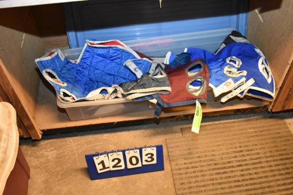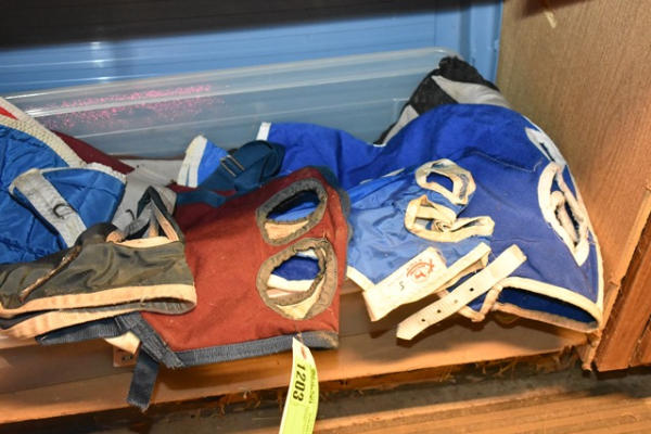 Mini horse hoods including quilted in size small, 2 nylon (non-quilted) and 2 winter medium size hoods