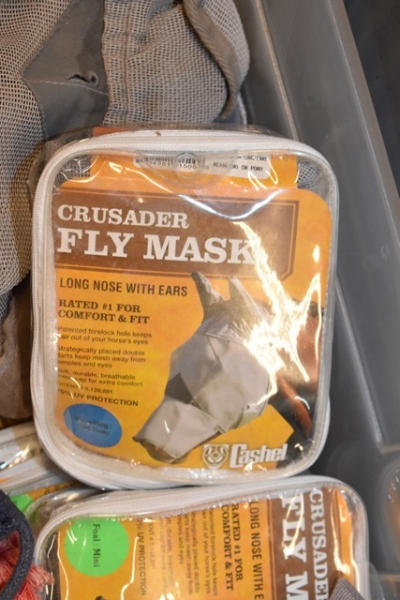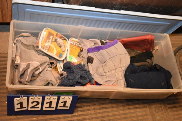 Tote full of supplies including 8 Cashel fly masks with ears and long nose (a few are new in the package), 6 knit ear fly bonnets, 1 cooler, 2 driving back pads, 3 mesh fly masks with no ears, 4 mesh fly masks with ears, and 2 roadster diapers