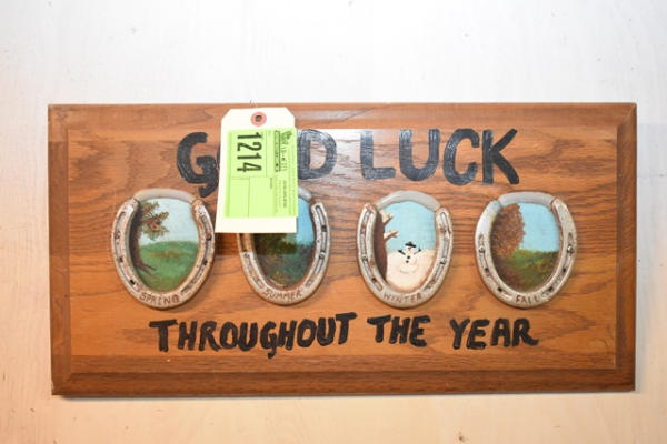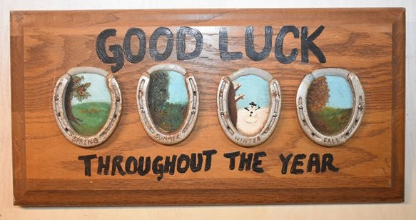 Wall plaque representing the 4 seasons and there is a painting inside each of the seasons inside each of the horseshoes