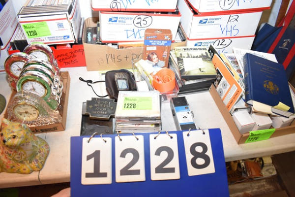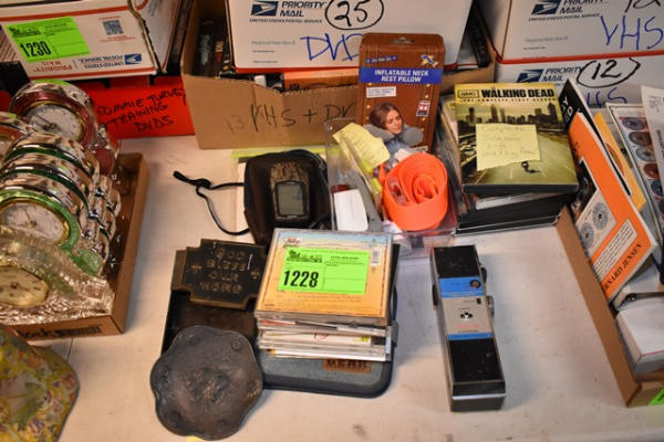 #1228 – Collection of various items including a Gamin E-track Personal Navigator, travel supplies including suitcase belt, converter plugs, locks, etc. needed for travel, inflatable pillow, also has 18 CDs and games with a carrying case, The Complete Season of the Walking Dead 1-8, a Realistic TRC 75 3 channel handheld CB and misc. bronze "Bless Our Home", Pharoah's horses plaque, and a doctor's medical note pad