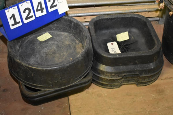 Lot of 2 round 18" diameter and 2 rectangular 20" x 15" pan feeder and 3 salt block holder drilled for drainage (17" x 17")
