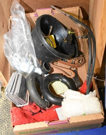Lot of assorted stall signs with stall latch hardware, chain curbs, straps, boil donuts and misc. fleece for halters, slip-on spurs, etc.