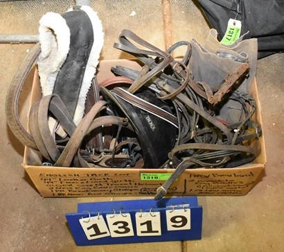 English tack lot including 44" leather girth, 44" leather fleece lined girth, older size medium Troxel helmets, 2 English cavessons, 1 PR break away step up, 1 PR Never Rust stirrup, assorted brow bands, bridles, egg butts and half chaps
