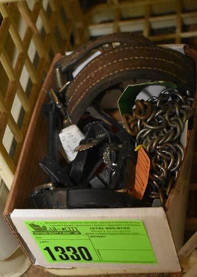 Copper tack training bands, rubber bit guards, check straps, check bit attachments, strap with conchos and 9 curb chains, mane pullers, surgical stainless steel scissors and clamps, 2 pill crushers, brush, hand sanitizer, misc. snaps, etc.