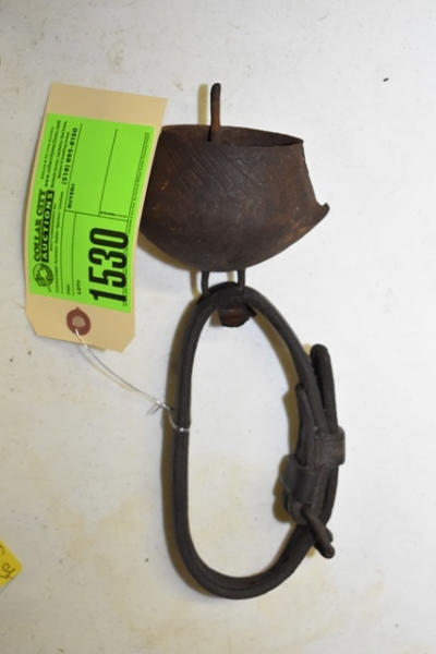 Lot of 3 10" large cast iron hooks, 1 5" hook, 1 4" hook and 1 old cow bell