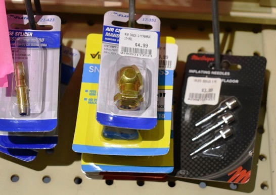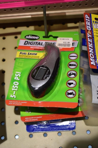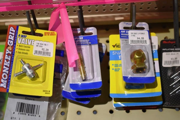 Lot of tire items including valve stem remover, digital tire pressure gauge, inflating needles, etc.