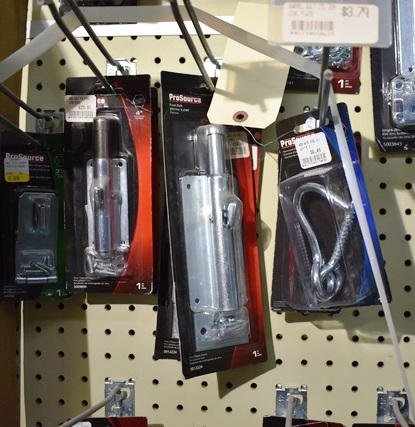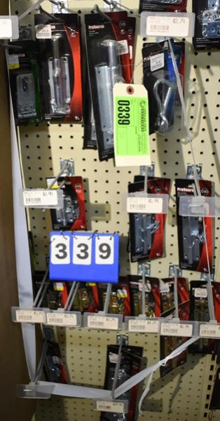 Peg board lot of Pro Source slide bolts, hasps, etc.