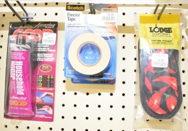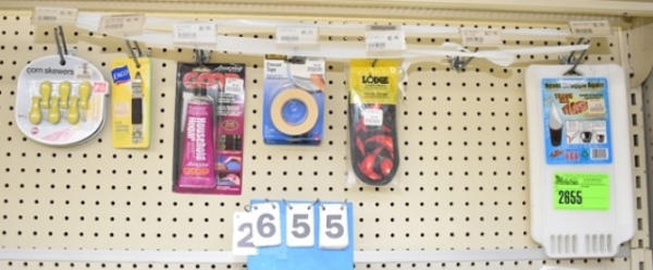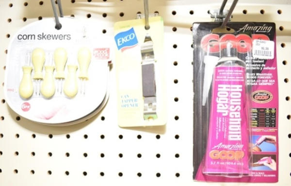 Lot of assorted items including corn skewers, can opener, freezer tape
