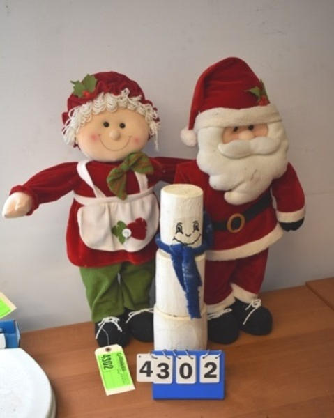 Lot of 2 Santa Claus figurines and a wooden marshmallow snowman