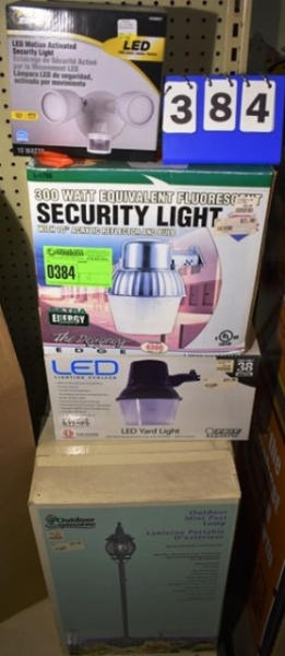 Lot consisting of 2 outdoor mini post lamps, LED yard light, 300 watt equivalent security light and an LED motion activated security light