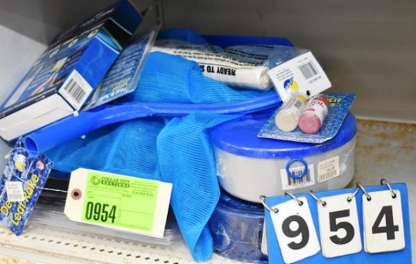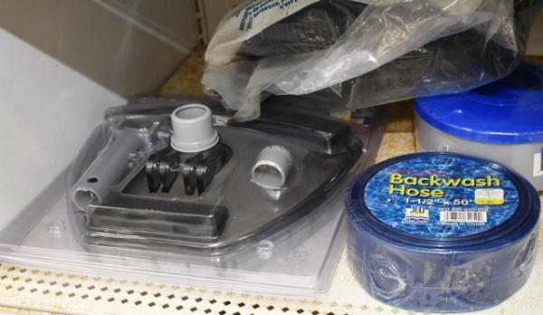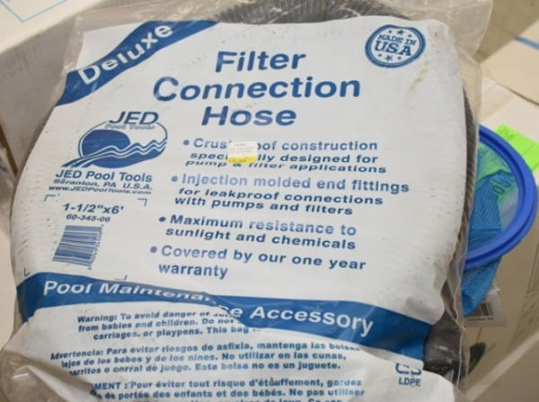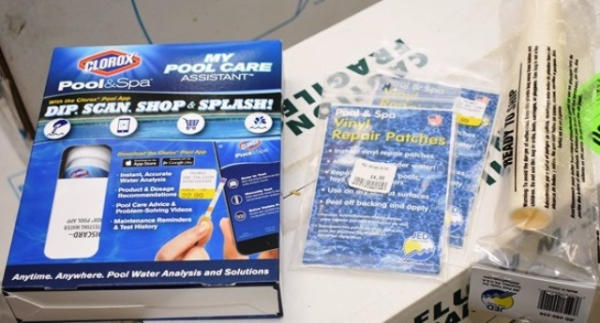 Lot of pool accessories including hose connector, back wash hose, test kit