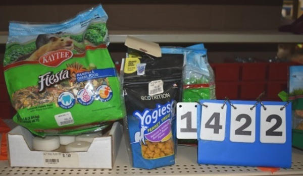 Lot consisting of rabbit, ferret, gerbil and hamster treats, also includes 4.5 lb. bag of hamster/gerbil food and small salt spools