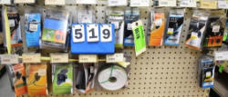 Peg board lot of RV items including hose elbow, Precision Curve Ball Levels, Sewer Hose Adapter, etc.