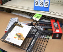 Lot including Grill Pro detachable hamburger basket and Weber Barbecue Tool Set